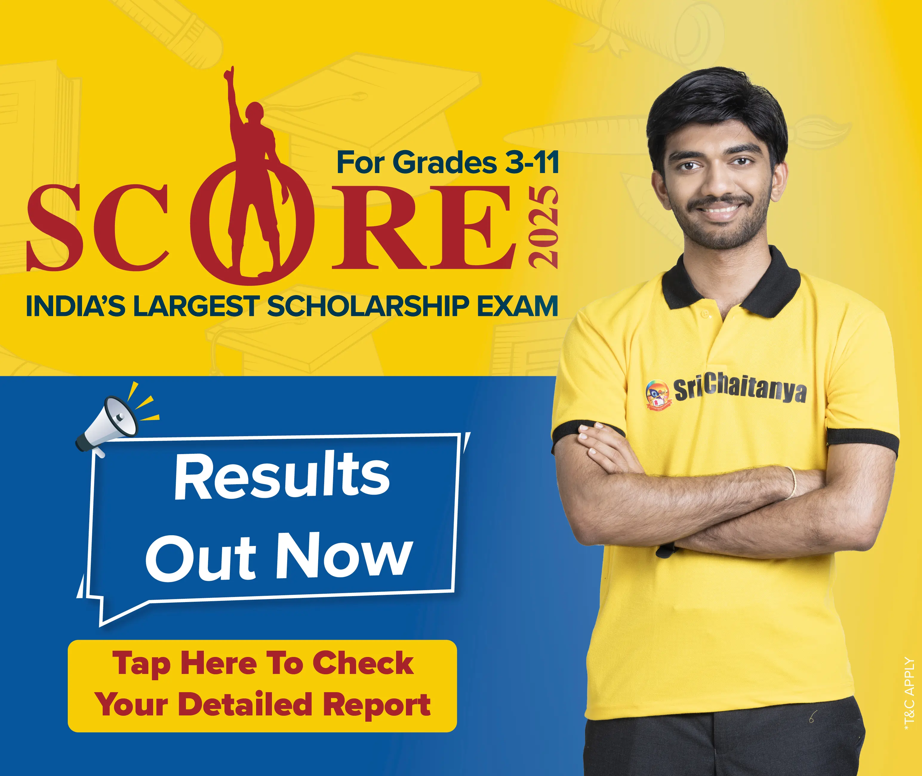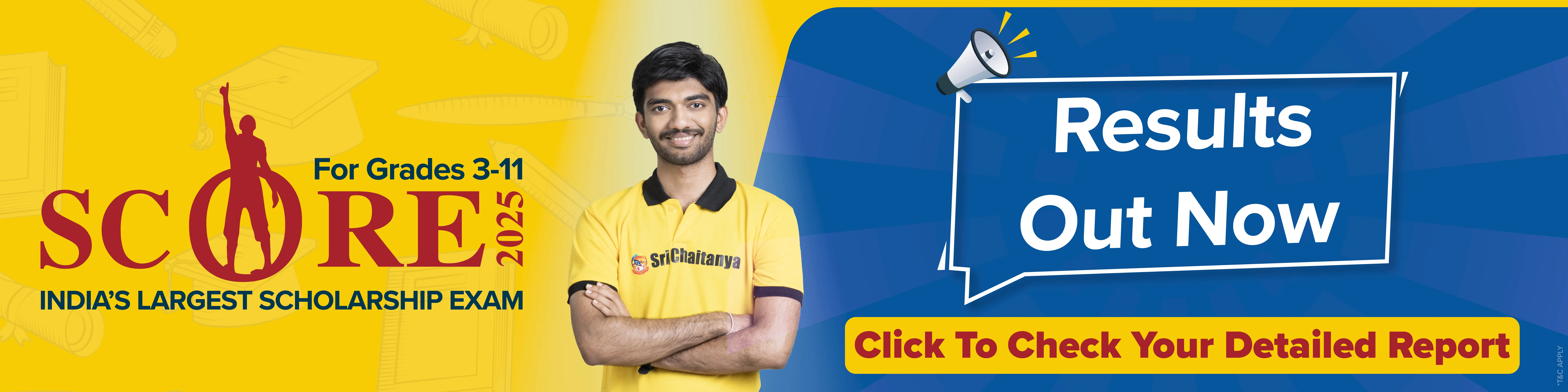 The SCORE (Sri Chaitanya Outstanding Achievers Reward Examination) Is an All-India Scholarship and Talent Seach Exam. Sri Chaitanya Educational Institutions organizes this exam, to identify and reward talented students from Class 3 to Class 12 who aspire to excel in competitive exams like JEE, NEET, CBSE, ICSE, and State Board exams.